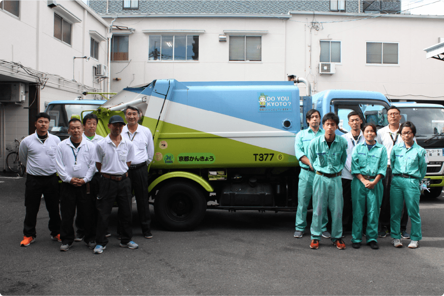 京都市からの受注で、家庭や観光地から排出される一般廃棄物の収集運搬を行っています。また京都市北部クリーンセンターでは、ペットボトルやアルミ缶など資源ごみの分別業務を行っています。