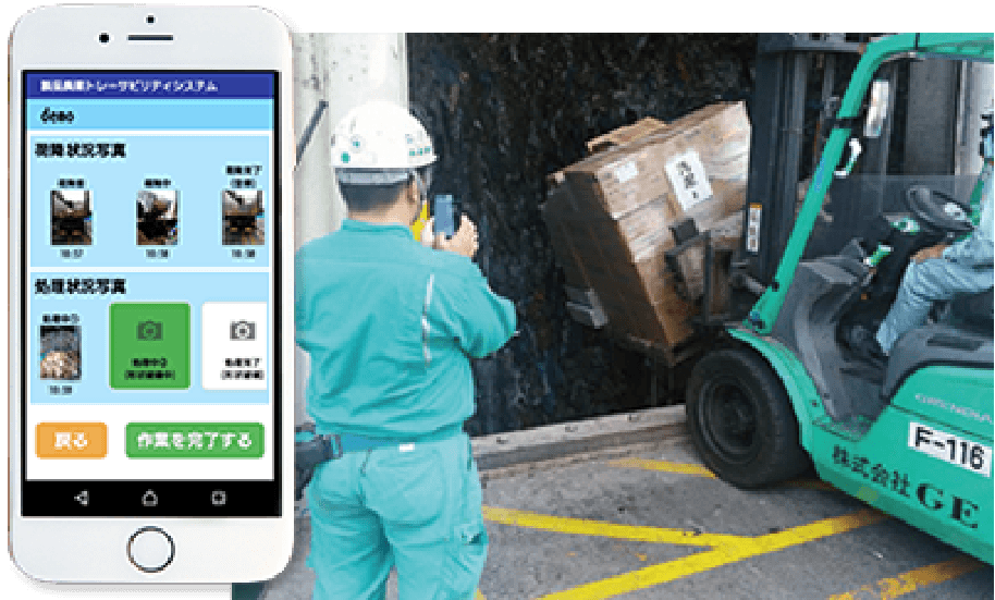 廃棄物の状況を写真・動画にクラウド上に保存し、お客様はPCやスマートフォンから、IDとパスワードを入力するだけで廃棄状況を確認することができます。廃棄への立会いを必要としないため、効率的かつ安心安全に廃棄物処理の管理をすることが可能です。