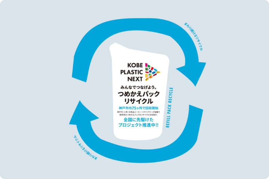 神戸市と小売・日用品メーカー・リサイクラー(再資源化事業者)が循環型社会の実現に向けて協働して行う「神戸プラスチックネクスト~みんなでつなげよう。つめかえパックリサイクル~」に参画。神戸市内の店舗に回収ボックスを設置、洗剤やシャンプーなど使用済みのつめかえパックを分別回収して再びつめかえパックに戻す「水平リサイクル」を目指します。当社はリサイクラーとして、回収ボックスからつめかえパックを回収し、分別を行っています。