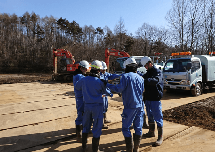 非常事態の中、仮置場を管理することから我々の業務はスタートします。スピードが求められ慌ただしくなりがちな現場ですが、非常時だからといって安全や環境配慮をおろそかにはできません。ケガをしない、させない為に毎朝のKY(危険予知活動)、作業手順の順守。廃棄物の飛散や土の持出し対策、周辺道路の清掃活動。