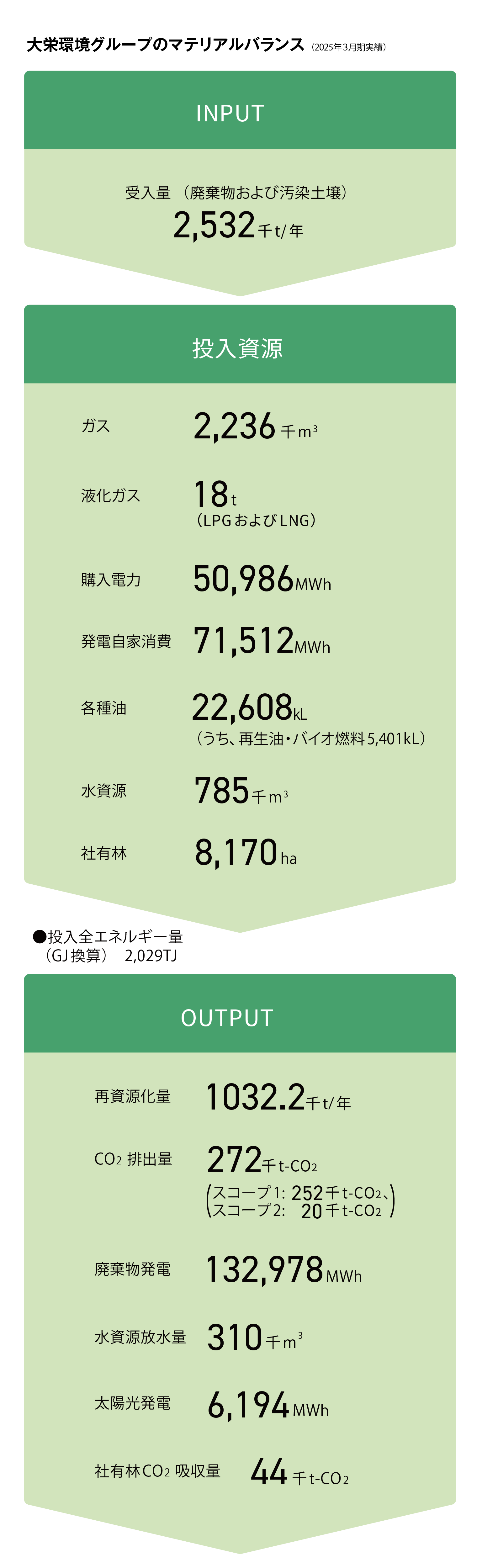 ⼤栄環境グループが所有する太陽光発電設備による2025年3⽉期の総発電量は6,194MWhとなりました。FIT制度を活⽤した売電は5,550MWhとなりました。これは0.2万トンの温室効果ガス削減貢献量に相当します。