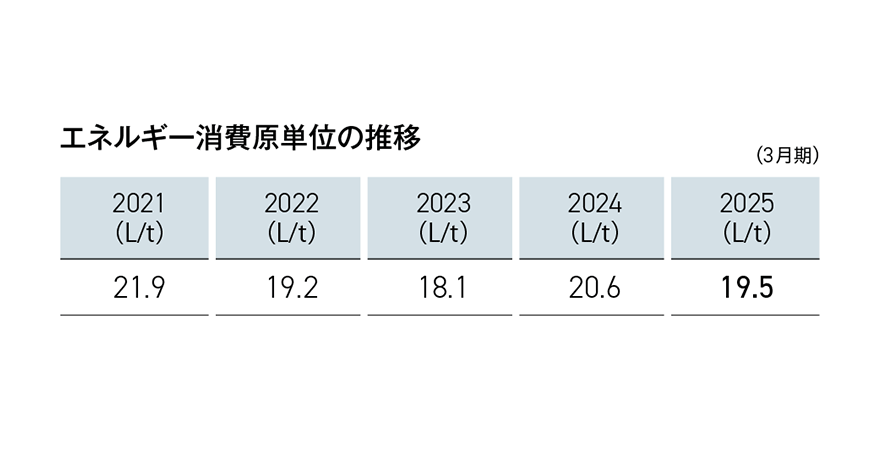 2025年3月期のエネルギー使用量(石油換算)は43,676キロリットル、エネルギー使用による温室効果ガス排出量は8.6万トンとなり、前期と比較すると0.6万トンの減少となりました。要因としては、新炉建替を見据えたガス化溶融炉の停止による燃料使用の減少、2023年に稼働した新規焼却炉の発電自家消費による電気使用の削減が考えられます。