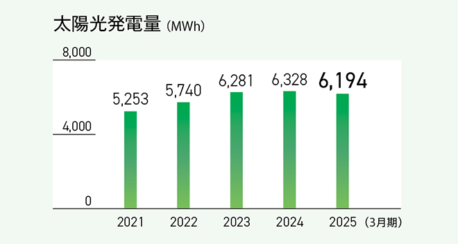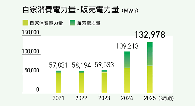 2025年3月期の総発電量は132,978MWhとなりました。このうち、販売電力量は61,467MWhで、削減貢献量2.6万トンに相当します。