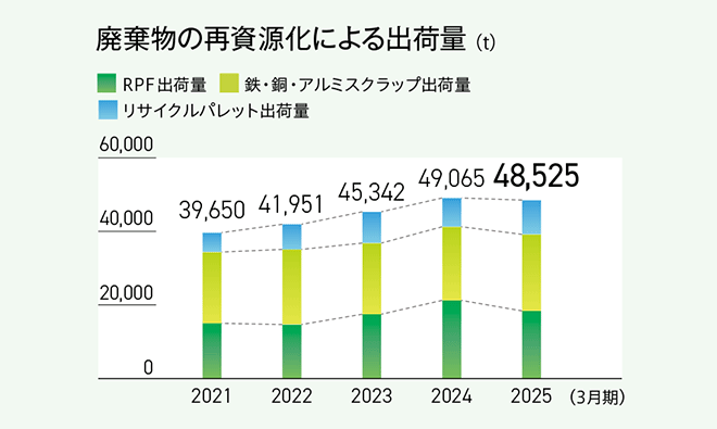 RPF、鉄・銅・アルミスクラップ、およびリサイクルパレットなどのさまざまな廃棄物の再資源化に取り組み、温室効果ガス削減に貢献しています。2025年3月期の出荷量は48,525トンとなり、温室効果ガス削減貢献量11.7万トンに相当します。