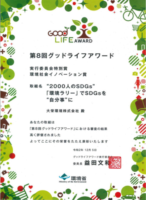 大栄環境グループでは、このような取り組みを過去10年以上にわたって継続してきました。サステナブルラリーの前身となる「環境ラリー」では、環境省主催の第8回グッドライフアワードで「実行委員会特別賞」や「環境社会イノベーション賞」を受賞しました。今後もサステナブルラリーを通じた人財づくりを推進していきます。