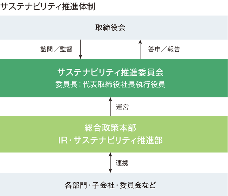大栄環境グループは、気候変動や人的資本をはじめとするサステナビリティ課題に対応するため、代表取締役社長執行役員を委員長とするサステナビリティ推進委員会を設置しています。当委員会において、サステナビリティに関する各種方針やリスク・機会の評価などについて年2回以上の頻度で議論し、その結果を取締役会に答申しています。取締役会は、当委員会からの答申・報告に基づき重要事項の決定および監督を行っています。