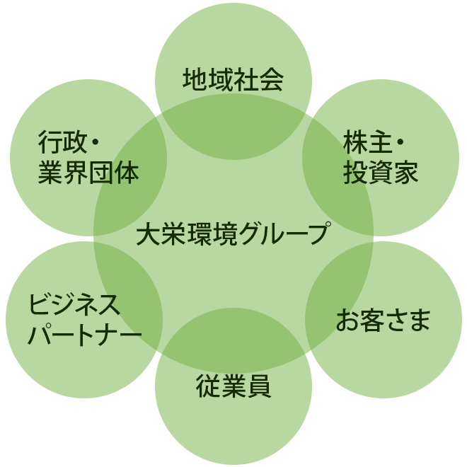 大栄環境グループは、「お客様」「株主・投資家」「ビジネスパートナー」「行政・業界団体」「地域社会」「従業員」など、多様なステークホルダーの皆さまとの関係を大切にし、その信頼に応えることで、事業を通じた新たな価値を生み出していきます。
