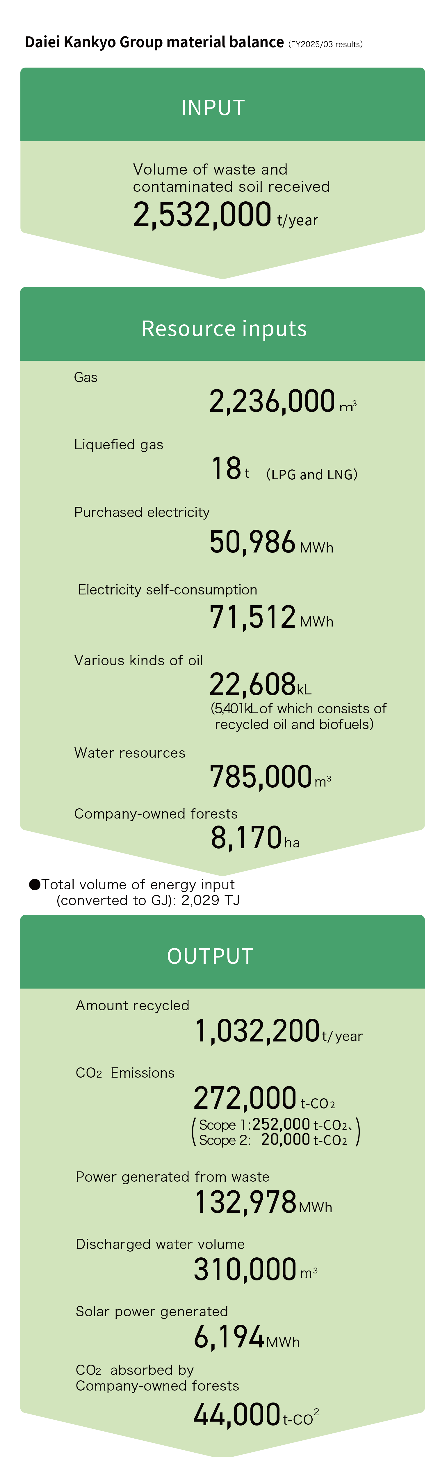This diagram shows (1) inputs (energy and resources) and (2) outputs (emissions) generated in the course of our business activities. The Daiei Kankyo Group assesses the environmental footprint of its extensive business activities, and promotes a variety of initiatives to further reduce the impact of these activities.