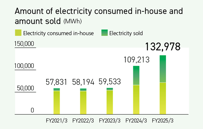 In the fiscal year ended March 31, 2025, the total amount of electricity generated was 132,978 MWh. Of this amount, 61,467 MWh was sold, equivalent to a reduction contribution of 26 kt.