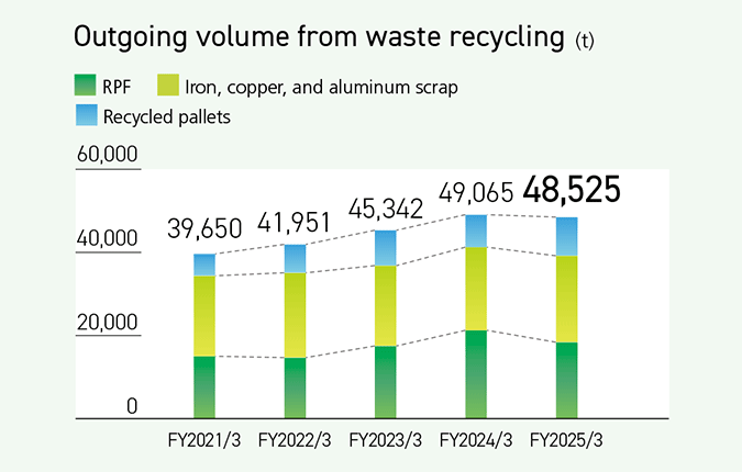 We help reduce greenhouse gas emissions by recycling a variety of waste materials such as RPF; iron, copper, and aluminum scrap; and recycled pallets. For the fiscal year ended March 31, 2025, our outgoing volume was 48,525 tons, equivalent to a greenhouse gas emission reduction contribution of 117 kt.