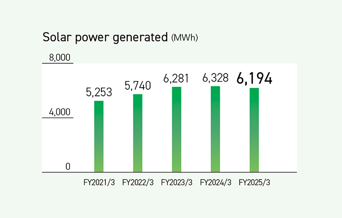 The total amount of electricity generated by the Group’s solar power generation facilities in the fiscal year ended March 31, 2025 was 6,194 MWh. Electricity sales utilizing the feed-in-tariff (FIT) system amounted to 5,550 MWh. This is equivalent to a greenhouse gas emission reduction contribution of 2 kt.