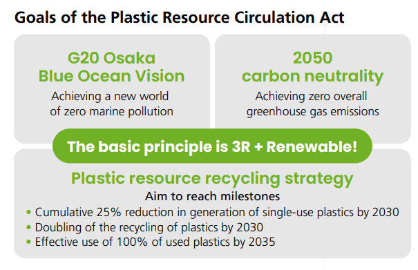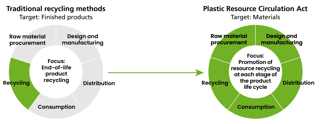It is a law that took effect in April 2022. Focusing on just one material, plastic, it aims to promote resource recycling throughout the entire life cycle of plastic products, including design, sales, and disposal.