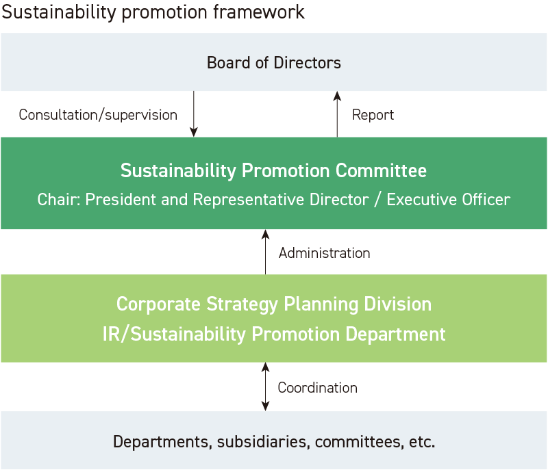 The Daiei Kankyo Group has established the Sustainability Promotion Committee chaired by the President and Representative Director / Executive Officer to address climate change, human capital, and other sustainability issues. The committee discusses various sustainability-related policies as well as risks and opportunities at least twice a year, and reports the results of these discussions to the Board of Directors. The Board of Directors then makes decisions and supervises important matters based on the reports from the committee.