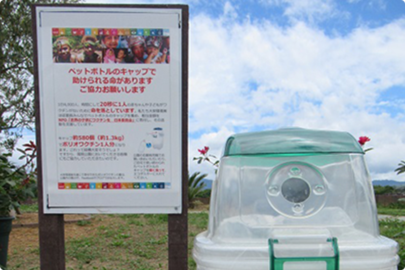 4,000 babies and children die every day, or 1 every 20 seconds, due to a lack of vaccines.* We collect plastic bottle caps with the cooperation of all our employees as well as other organizations and individuals who support our activities, and donate the equivalent amount of raw materials (15 yen per kilogram) to the Japan Committee, Vaccines for the World’s Children. The collected caps are turned into plastic pallets at our plastic recycling plant.