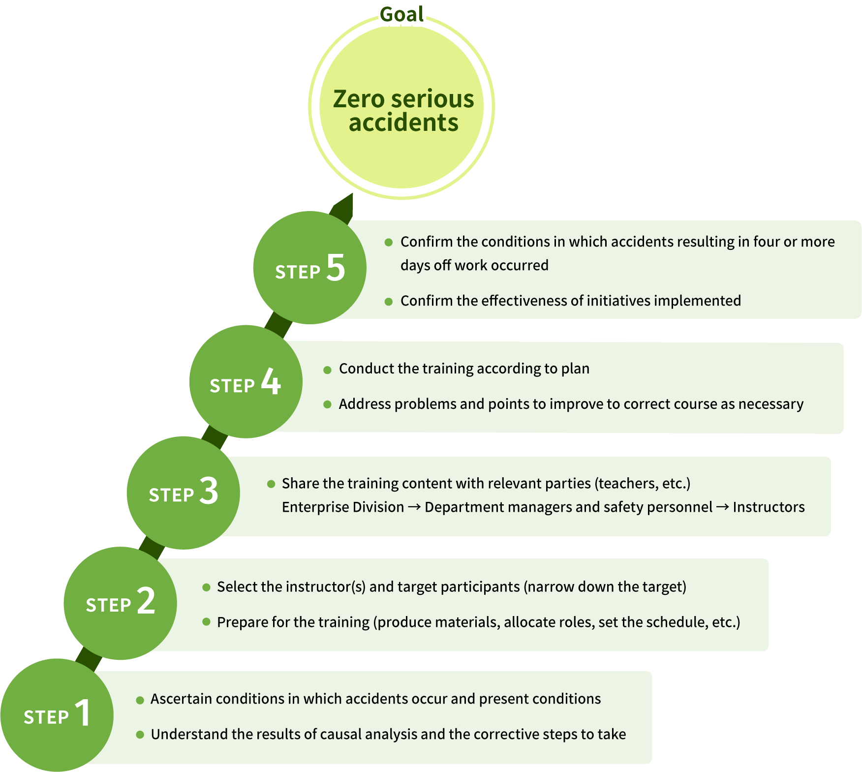 Each fiscal year, each business location formulates safety and health activity plans and engages in safety and health activities aimed at reducing the number of accidents / occupational accidents, based on these common philosophy and policy.