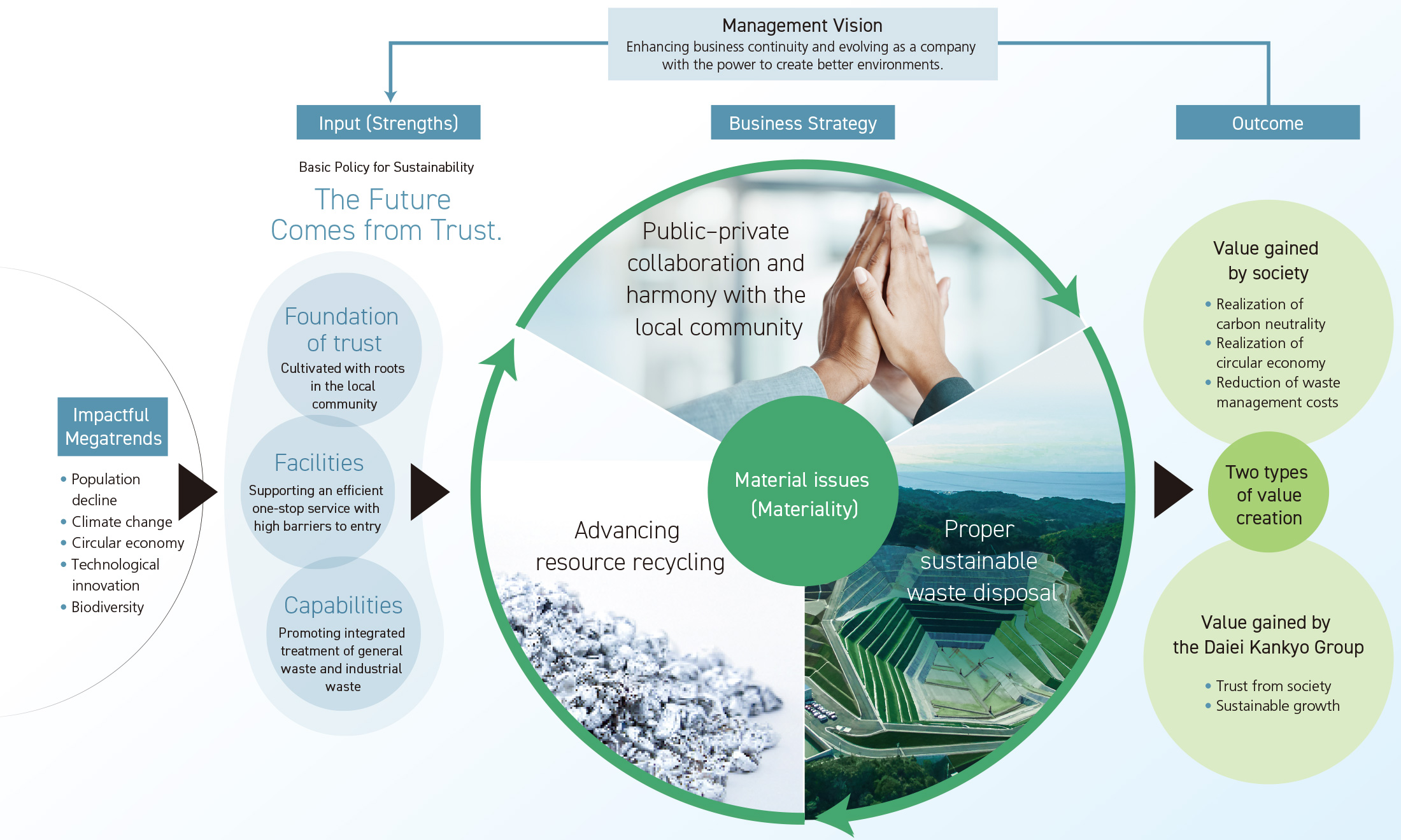 The Daiei Kankyo Group has been issuing environmental reports since 2006. We believe that by making as many of our stakeholders as possible aware of our various business activities to date through this report, we can increase the corporate value and trust of the Daiei Kankyo Group.