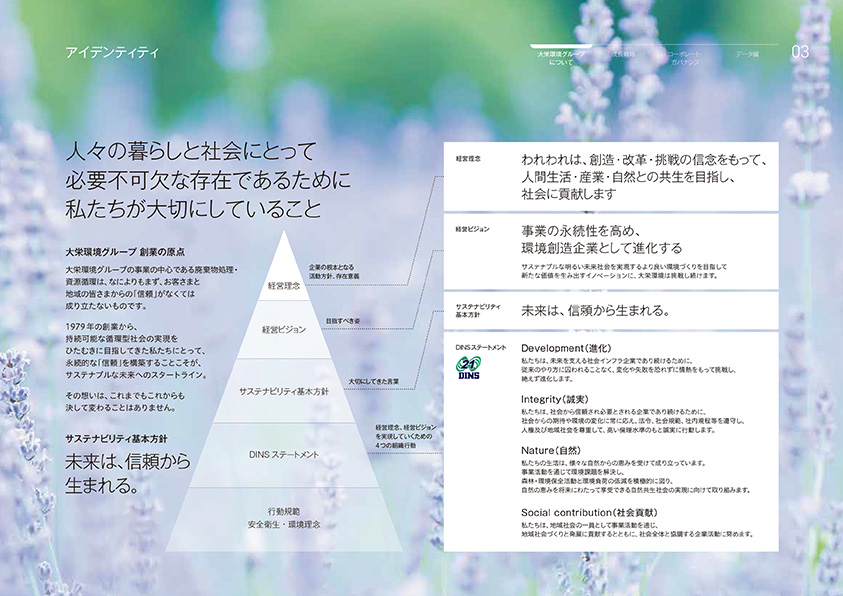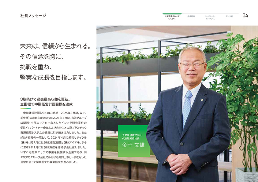 本報告書は大栄環境グループ初となる統合報告書であり、投資家の皆さまに、理念、経営戦略とその進捗、企業価値向上に向けたさまざまな取り組みを知っていただくこと、また、皆さまとの建設的な対話のきっかけになることを目指して編集しました。