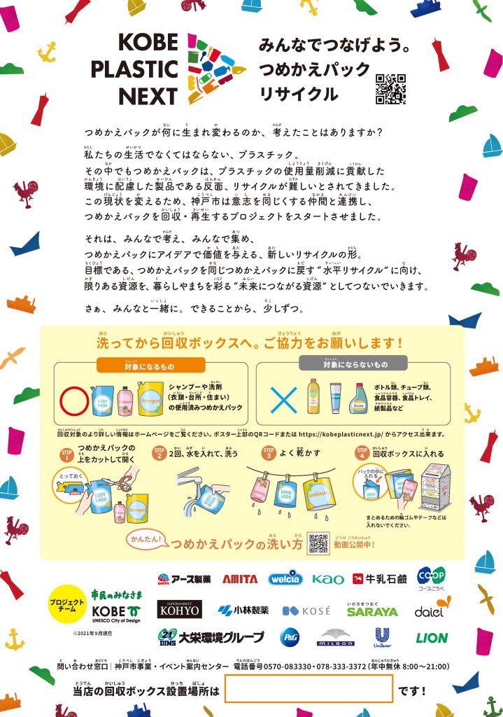 神戸市内75店舗に回収ボックスを設置、洗剤やシャンプーなど使用済みのつめかえパックを分別回収して再びつめかえパックに戻す「水平リサイクル」を目指します。